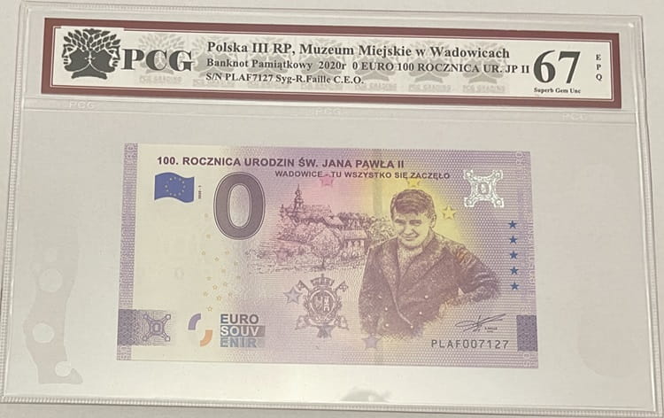 Banknot kolekcjonerski / banknot pamiątkowy 0 euro polskie, materiał papier, zabezpieczenia banknotu: znak wodny, hologram, mikrodruk, elementy UV, stan zachowania Grading PCG 67 EPQ. Grading wysokiej jakości, twardy, solidnie wykonany, znakomicie zabezpieczający banknot.