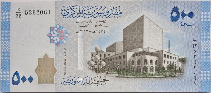Banknot o nominale 500 funtów syryjskich został wyemitowany w 2013 roku przez Central Bank of Syria. Jest to oryginalny środek płatniczy używany w Syrii. Egzemplarz w stanie UNC, bez śladów obiegu, o wymiarach około 150 x 65 mm.