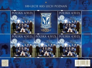 U góry arkusza złota gwiazdka oznaczająca ilość Mistrzostw Polski w XIX wieku (na dzień emisji znaczków). Poniżej poziomo dużymi literami białą czcionką napis: 100-lecie KKS Lech Poznań. Wokół arkusza byli reprezentanci klubu.