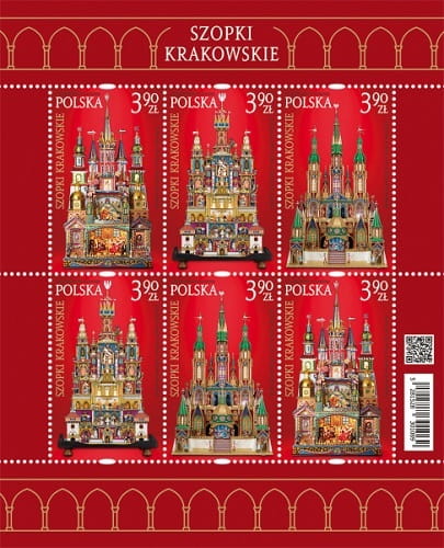 Szopki krakowskie 2023 r. - arkusz ze znaczkami kolekcjonerskimi o ograniczonym nakładzie pojedynczego znaczka 120 000 sztuk. Arkusz zawiera 6 znaczków w trzech rodzajach. Stan zachowania nowy