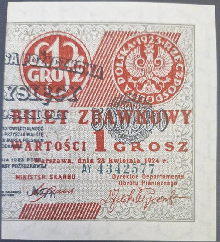 Nadruk awersu i rewersu monety 1 grosz z 1923. Poniżej dużymi literami napisy: Bilet zdawkowy / wartość 1 gorsz