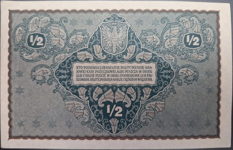 Na rewersie widnieje Biały Orzeł w koronie na tarczy w zielonym tle. Po prawej jak i po lewej stronie nominał banknotu 1/2. U dołu banknotu na środku również jego nominał. W tle banknotu ornamenty