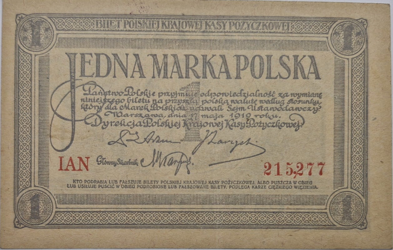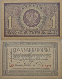 Banknot 1 marka polska 1919 r. - Banknot obiegowy emisja 17 maja 1919 rok.