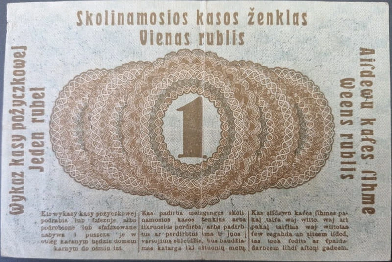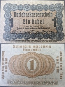 Po prawej i lewej stronie banknotu nominał 1. W centralnej części banknotu w dwóch rzędach napisy: Darlehnskassenschein / Ein Rubel. Wokół banknotu ozdobne ornamenty