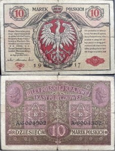 Banknot 10 marek polskich 1917 r. - Banknot obiegowy PRL (Polska Rzeczpospolita Ludowa). Materiał - papier, emitent - Narodowy Bank Polski, producent - Państwowa Wytwórnia Papierów Wartościowych w Warszawie.