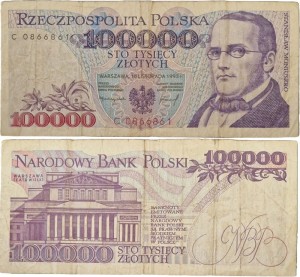 Banknot obiegowy PRL z serii Wielcy Polacy emitowane w lata 1974-1993 z kategorii banknoty PRL którym emitentem był Narodowy Bank Polski, producent PWPW Państwowa Wytwórnia Papierów Wartościowych, nominał 100000 złotych, wymiary banknotu 138 mm x 63 mm, materiał papier, drugi rok emisji 1993, projektant Andrzej Heidrich, banknot w folijce ochronnej, stan zachowania 3, real foto