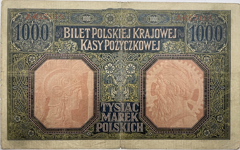Na rewersie banknotu rysunek z ornamentami. Dwa wieloboki, a w środku lewego głowa kobiety w hełmnie - Minerwa, a po prawej stronie głowa mężczyzny. W prawym górnym rogu banknotu i w lewym górnym jego nominał 1000. Na środku u góry w dwóch rzędach napis: BILET POLSKIEJ KRAJOWEJ / KASY POŻYCZKOWEJ. U dołu banknotu na środku w trzech rzędach napis: TYSIĄC / MAREK / POLSKICH