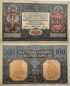 Banknot obiegowy w Generalnym Gubernatorstwie Warszawskim z kategorii banknoty II RP, emitowane przez Polską Krajową Kasę Pożyczkową, nominał 100 marek polskich, materiał papier, rozmiar banknotu 190 mm x 115 mm, rok emisji 1916, stan zachowania ok. -3, real foto
