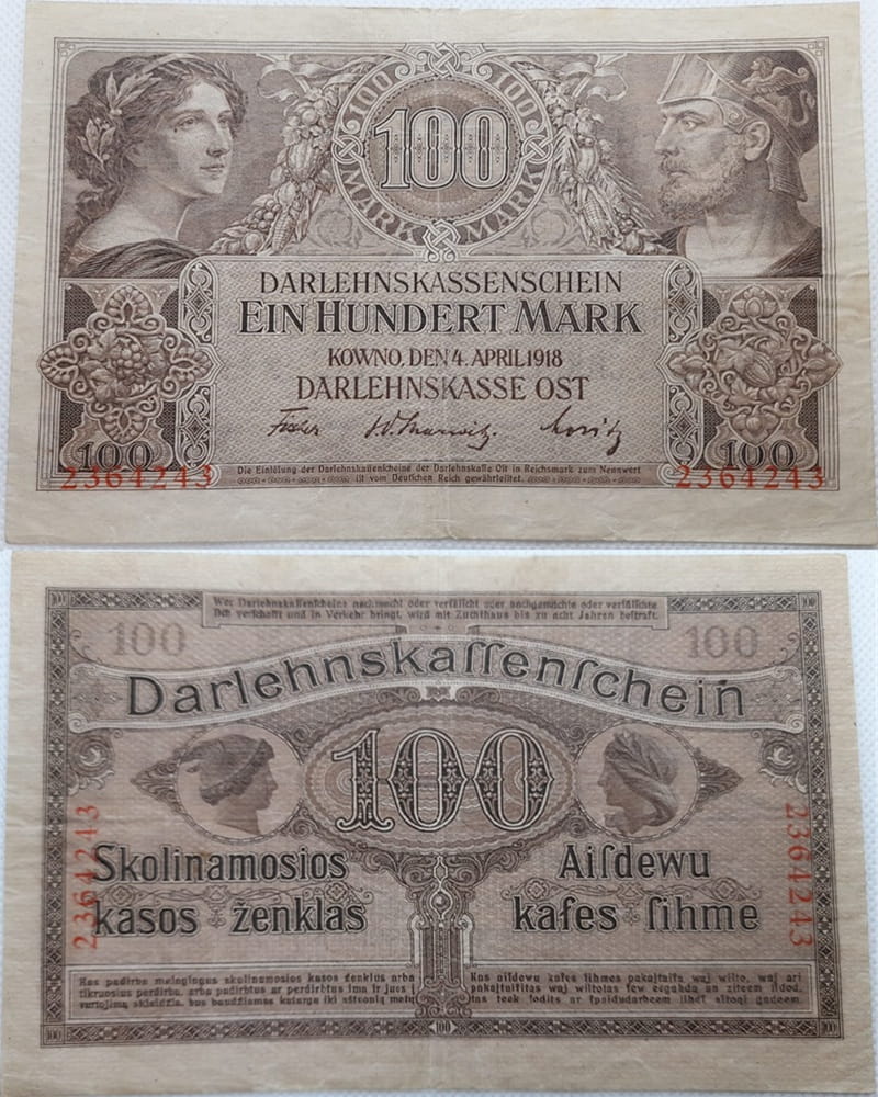 U góry po lewej stronie głowa kobiety z wieńcem na głowie, po prawej mężczyzny z hełmem na głowie. W środku u góry nominał 100. Poniżej w dwóch rzędach napisy: Darlehnskassenschein / Ein Hundert Mark. Poniżej miejsce emisji i data: Kowno 4 April 1918. U doły po prawej i lewej tronie pod ornamentami nominał 10 oraz czerwoną czcionką numer banknotu.