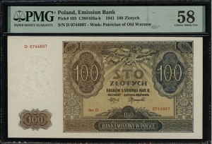 100 złotych 1941 r. - banknot w gradingu PMG 58 (Paper Money Guaranty). Grading, który jest zarazem certyfikatem potwierdzeniem stanu zachowania banknotu oraz potwierdzeniem jego autentyczności przez największą i najbardziej popularną firmę gradingową na świecie