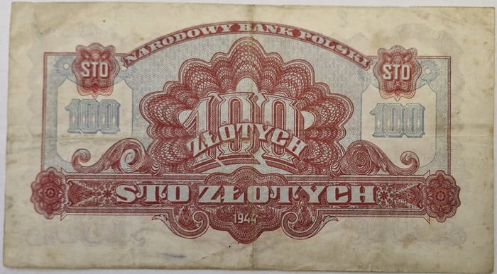 Na rewersie banknotu w jego centralnej części nominał 100 oraz słownie dużymi literami w dwóch u dołu: sto złotych. Poniżej rok emisji 1944. Nominał powtórzony w górnych rogach wśród ornamentów słownie sto