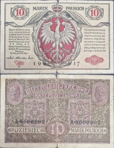 Banknot 10 marek polskich 1917 r. - Banknot obiegowy II Rzeczypospolitej Polskiej. Materiał - papier, emitent - Narodowy Bank Polski, producent - Państwowa Wytwórnia Papierów Wartościowych w Warszawie.