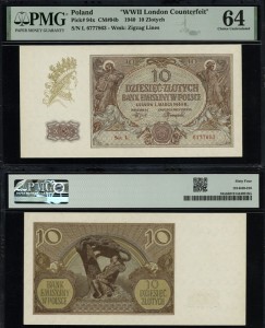 10 złotych 1940 r. - banknot obiegowy okresu okupacji niemieckiej, materiał papier, stan zachowania PMG64 grading, real foto