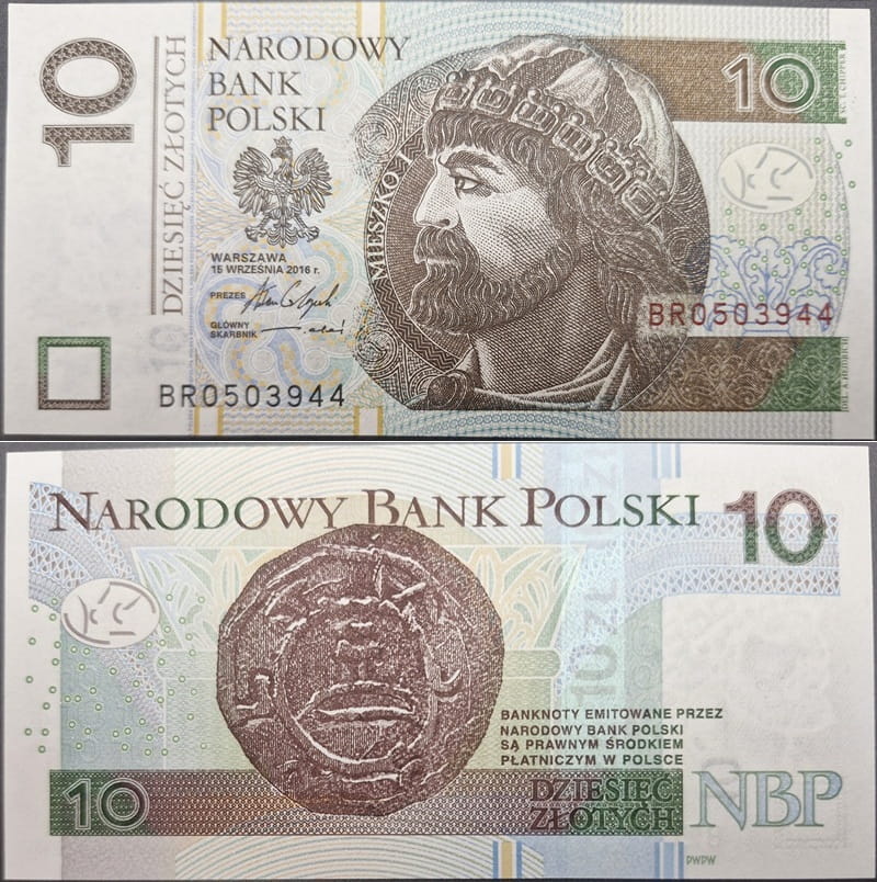 Banknot 10 złotych 2016 r. Mieszko I - Banknot obiegowy RP. Materiał - papier, emitent - Narodowy Bank Polski, producent - Państwowa Wytwórnia Papierów Wartościowych w Warszawie.