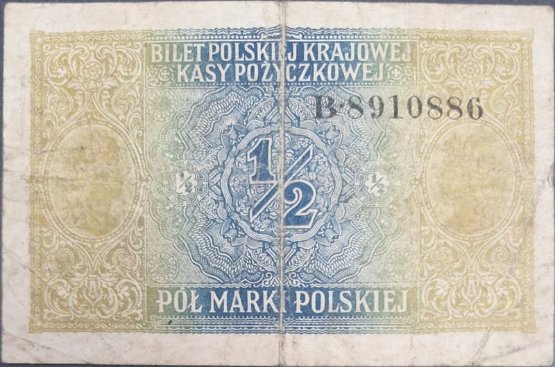 Na rewersie po lewej i prawej stronie głowa kobiety. U góry banknotu przy marginesie w dwóch rzędach" BILET POLSKIEJ KRAJOWEJ / KASY POŻYCZKOWEJ. U dołu banknotu numer i seria oraz napis dużymi literami: Pół marki polskiej.