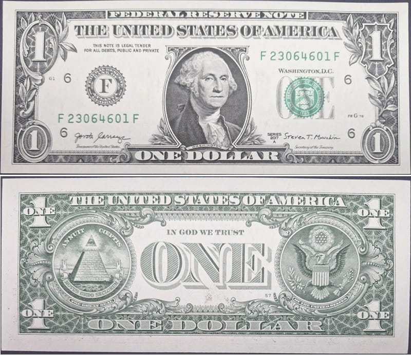 Banknot One dollar USA 2017 r. - oryginalny banknot obiegowy USA z paczki bankowej w stanie zachowania UNC / stan 1, wyselekcjonowany, z ostrymi rogami. Materiał papier, banknot w folijce ochronnej
