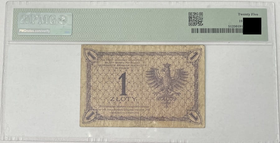 1 złoty 1919 r. - banknot w gradingu PMG 25 (Paper Money Guaranty). Grading, który jest zarazem certyfikatem potwierdzeniem stanu zachowania banknotu oraz potwierdzeniem jego autentyczności przez największą i najbardziej popularną firmę gradingową na świecie.