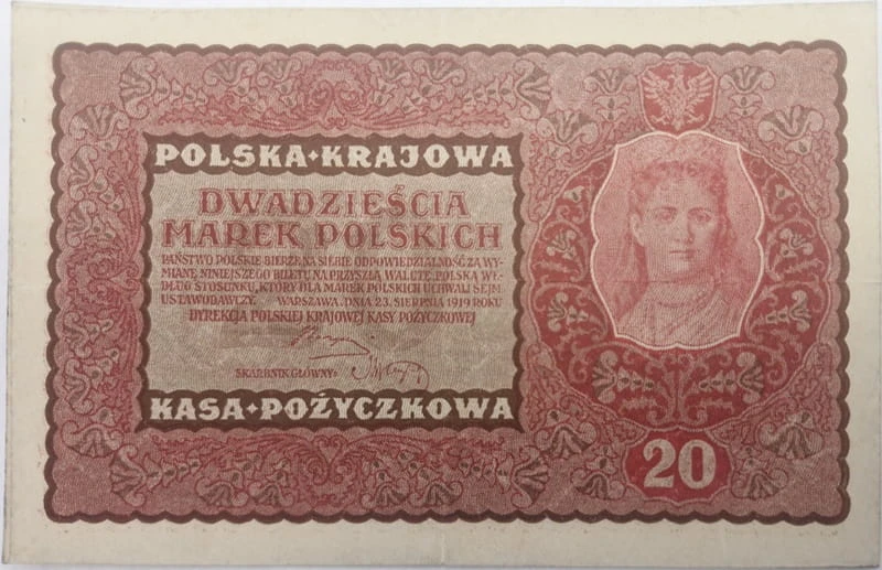 Banknot 20 marek 1919 - Polska Krajowa Kasa Pożyczkowa. Banknot obiegowy z okresu międzywojennego.