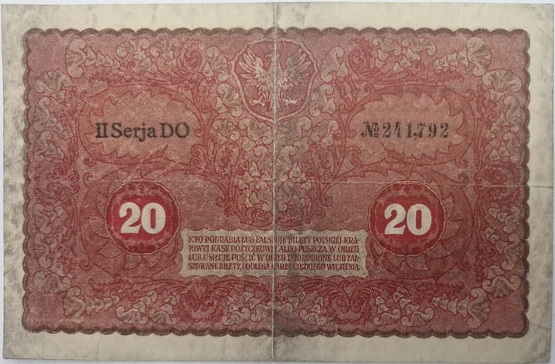 20 marek polskich 1919 - banknot obiegowy emitowany przez Polską Krajową Kasę Pożyczkową w Królestwie Polskim, emisja 23 sierpnia 1919 r. Banknot w stanie -3