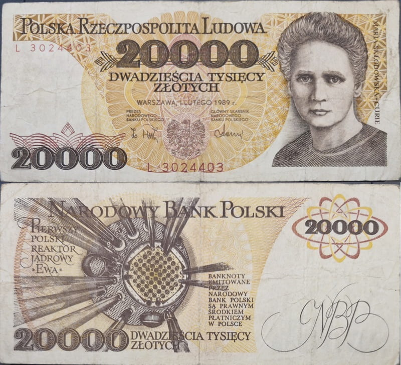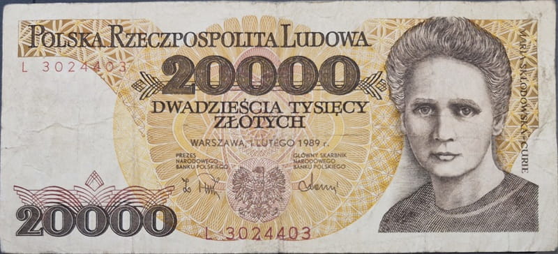 20000 zł Maria Skłodowska-Curie 1989 r. - Banknot obiegowy PRL.