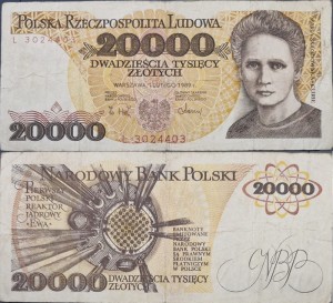 Banknot 20000 zł 1989 Maria Skłodowska-Curie stan 3