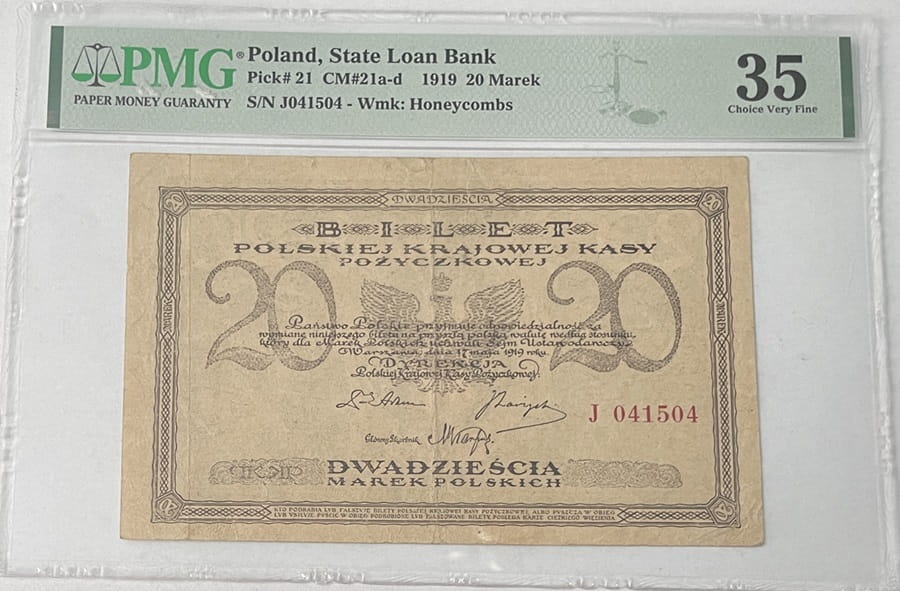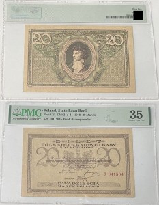 20 marek polskich 1919 - banknot obiegowy emitowany przez Polską Krajową Kasę Pożyczkową w Królestwie Polskim, emisja 17 maja 1919 r., materiał papier, stan zachowania PMG 35 grading, real foto