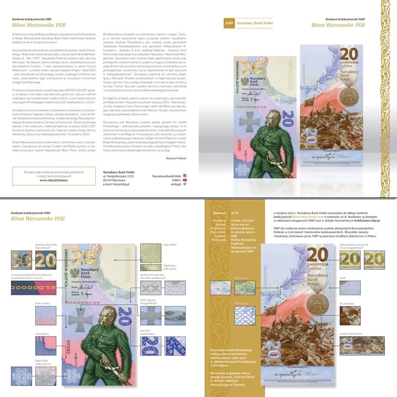 20 złotych Bitwa Warszawska 1920 2020 r. - banknot kolekcjonerski 20 złotych NBP, producent Państwowa Wytwórnia Papierów Wartościowych PWPW, materiał papier, banknot w etui, stan zachowania banknotu UNC stan 1