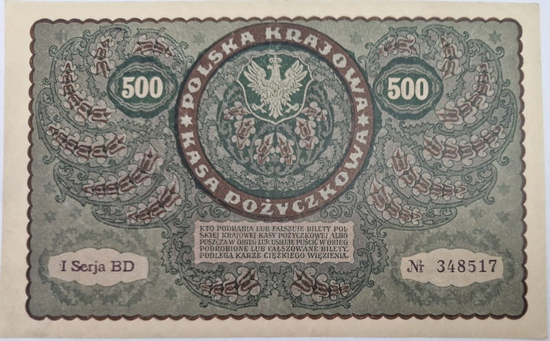 Banknot 500 marek 1919 - Polska Krajowa Kasa Pożyczkowa. Banknot obiegowy z okresu międzywojennego.