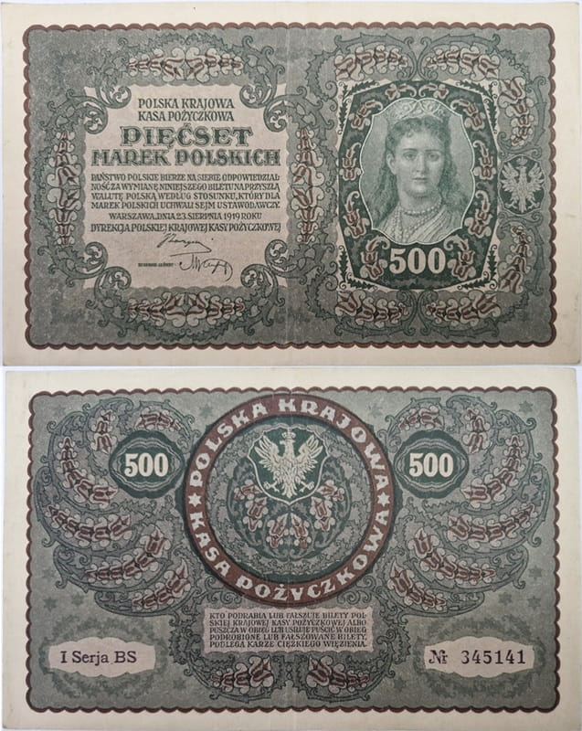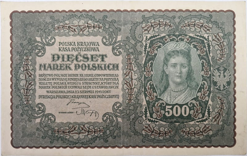 Banknot 500 marek 1919 - Polska Krajowa Kasa Pożyczkowa. Banknot obiegowy z okresu międzywojennego.