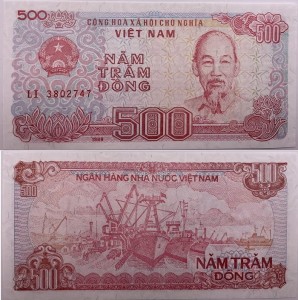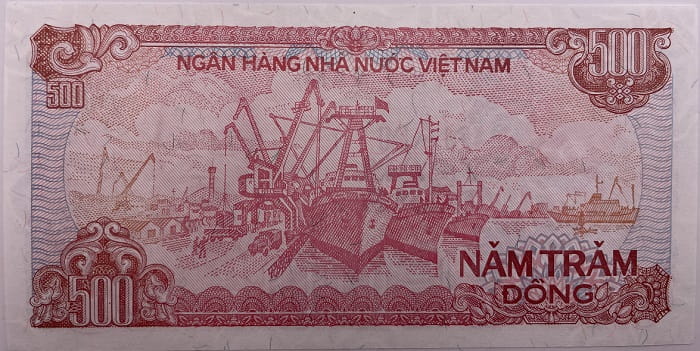 Banknot 500 dong z kategorii obiegowe banknoty świata kontynent Azja emitent Bank Wietnamu, rok emisji 1988 r., materiał papier, stan UNC