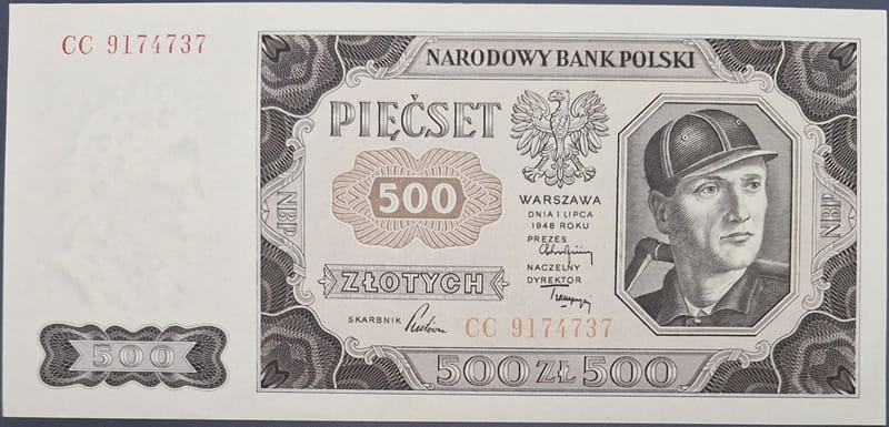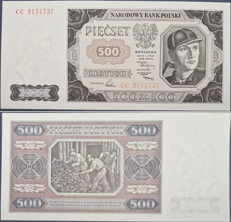 500 złotych 1948 r. - Banknot obiegowy PRL (Polska Rzeczpospolita Ludowa). Materiał - papier, emitent - Narodowy Bank Polski, producent - Państwowa Wytwórnia Papierów Wartościowych w Warszawie.