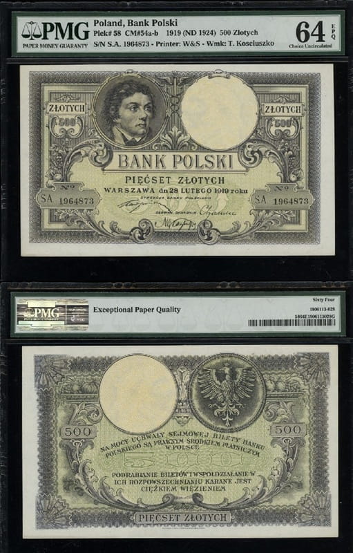 Banknot obiegowy o nominale 500 złotych z kategorii banknoty obiegowe II Rzeczpospolitej Polskiej, emitent Bank emisyjny w Polsce, emisja po odzyskaniu przez polskie niepodległości, materiał papier, wymiary 180 mm x 110 mm banknotu rok emisji 1919, stan zachowania grading z oceną PMG64, real foto