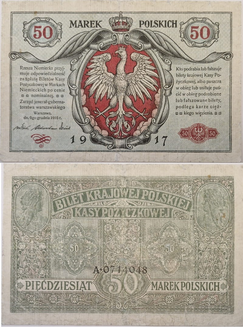 Banknot obiegowy w Generalnym Gubernatorstwie Warszawskim, emitowane przez Polską Krajową Kasę Pożyczkową, nominał 50 marek polskich, materiał papier, rozmiar banknotu 160 mm x 105 mm, rok emisji 1916, rok wprowadzenia do obiegu 1917, autor projektu nieznany, stan zachowania ok. -3/+4, real foto
