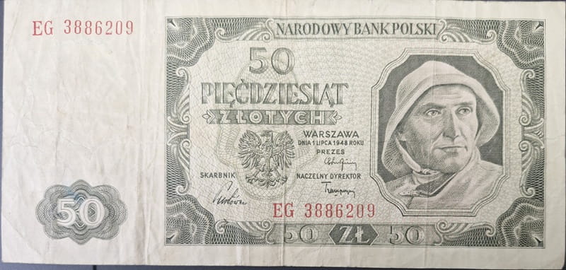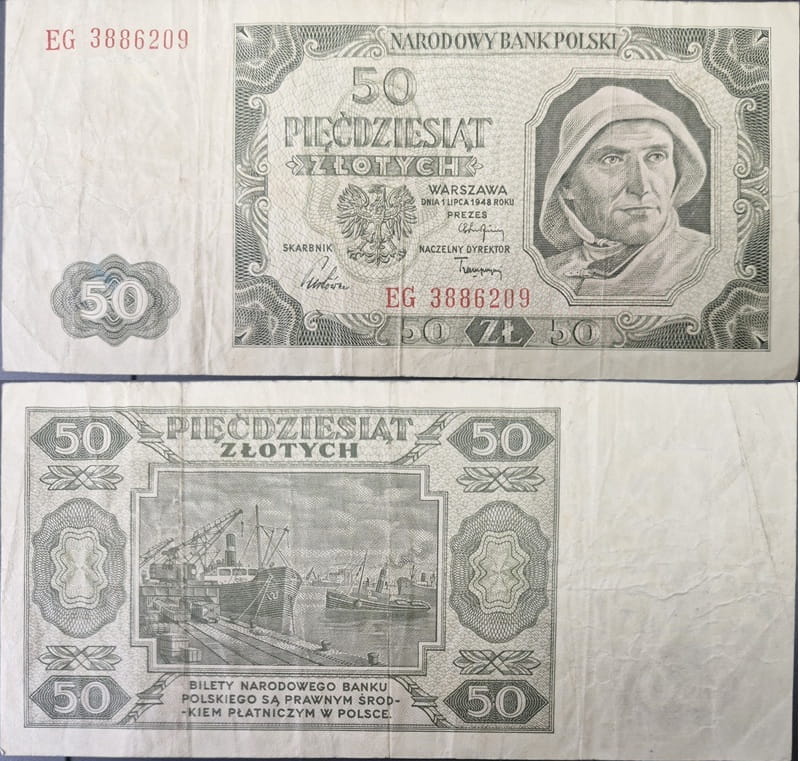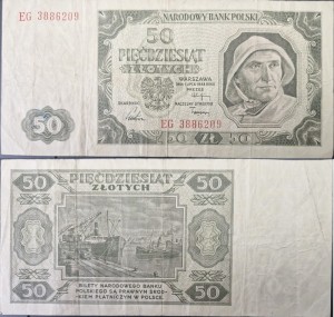 Banknot 50 złotych 1948 r. - Banknot obiegowy PRL (Polska Rzeczpospolita Ludowa). Materiał - papier, emitent - Narodowy Bank Polski, producent - Państwowa Wytwórnia Papierów Wartościowych w Warszawie.
