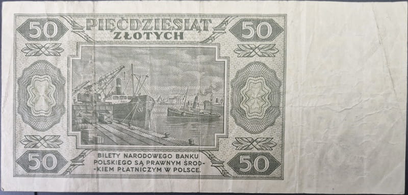 Na rewersie w centralnej jego części stylizowany port przycumowany statek oraz kilka pływających. Na zadrukowanym polu w czterech jego rogach nominał banknotu 50. W dolnej części banknotu napis w trzech rzędach: Bilety Narodowego Banku / Polskiego są prawnym środ-/ -kiem płatniczym w Polsce