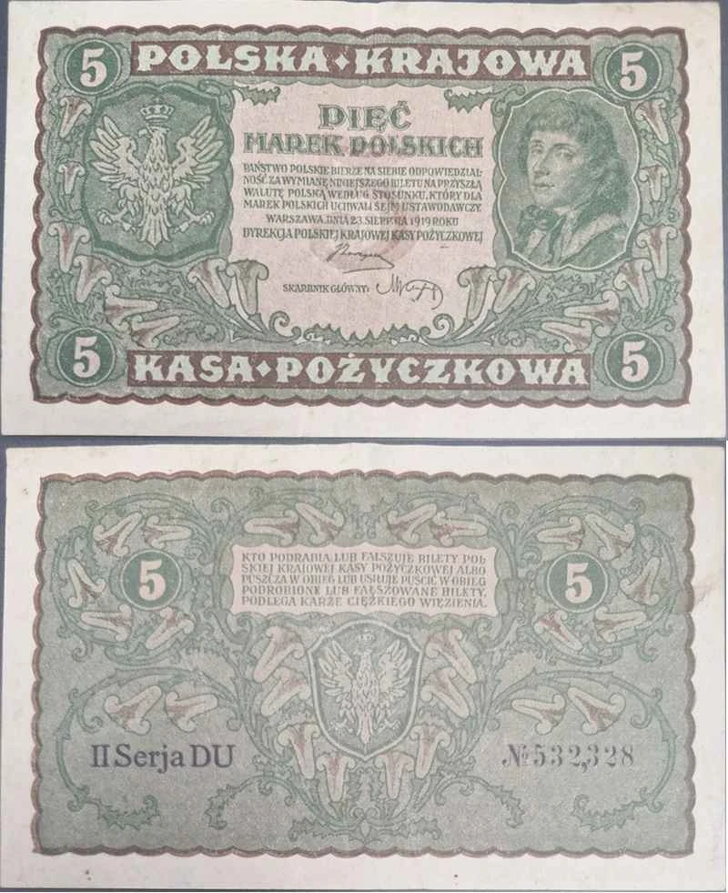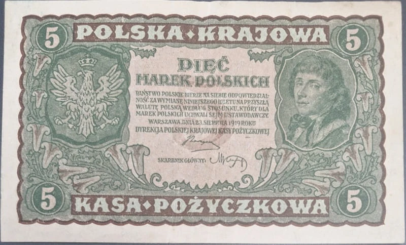 Banknot 5 marek Polskich 1919 r. - Polska Krajowa Kasa Pożyczkowa. Banknot obiegowy z okresu międzywojennego.
