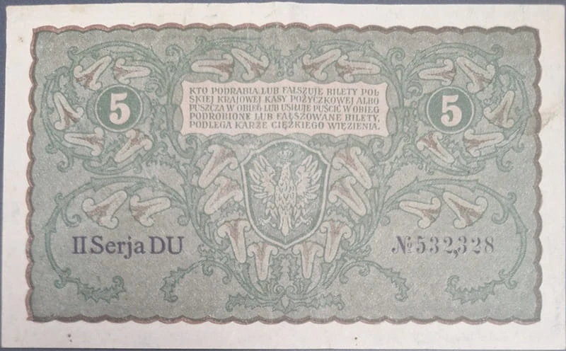 5 marek polskich 1919 - banknot obiegowy emitowany przez Polską Krajową Kasę Pożyczkową w Królestwie Polskim, emisja 23 sierpnia 1919 r. Banknot w stanie 3