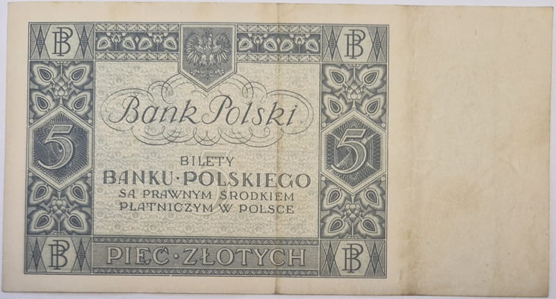 Na rewersie banknotu widnieje po prawej i po lewej stronie nominał banknotu 5 w ozdobnych ornamentach. Na środku banknotu w dwóch rzędach napis: BANK POLSKI. U dołu banknotu poziomo napis: PIĘĆ ZŁOTYCH. Wokół banknotu szeroki biały margines (pole bez nadruku)