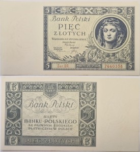 Banknot obiegowy okresu międzywojennego 5 złotych rok emisji 1930, emitent Bank Polski, materiał papier, banknot w folii ochronnej, materiał papier, wymiary banknotu, 144 mm x 78 mm, projektant banknotu Ryszard Kleczkowski, stan zachowania 1 real foto