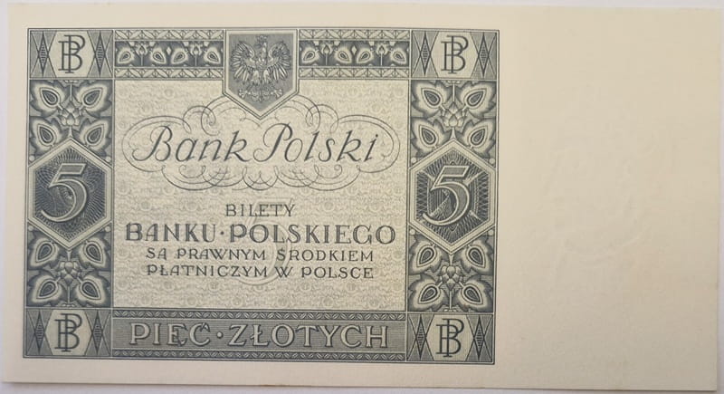 Na rewersie widnieje po prawej i po lewej stronie nominał banknotu 5 w ozdobnych ornamentach. Na środku banknotu w dwóch rzędach napis: BANK POLSKI. U dołu banknotu poziomo napis: PIĘĆ ZŁOTYCH. Wokół banknotu szeroki biały margines (pole bez nadruku)
