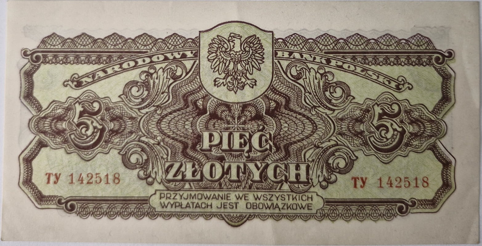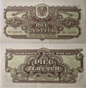 Awers banknotu 5 zł 1944