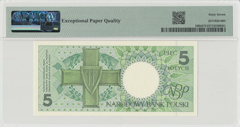 Banknot w gradingu PMG 67 EPQ (Paper Money Guaranty). Grading, który jest zarazem certyfikatem potwierdzeniem stanu zachowania banknotu oraz potwierdzeniem jego autentyczności przez największą i najbardziej popularną firmę gradingową na świecie z USA