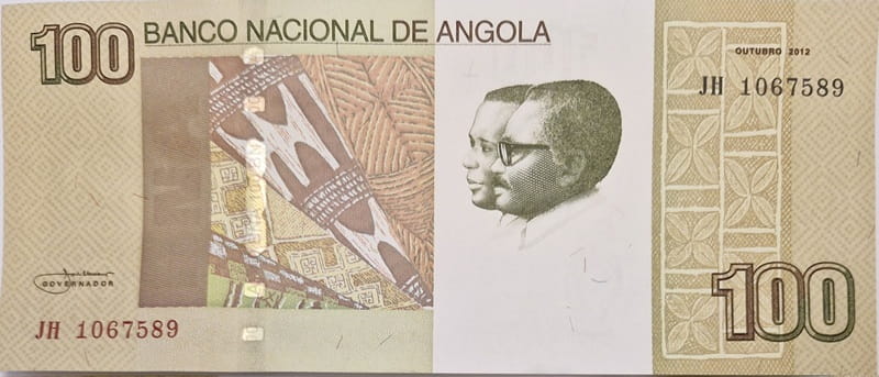 Awers banknotu Angola 100 kwanzas 2012 – popiersia dwóch mężczyzn