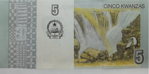 Na rewersie po prawej stronie znajduje się grafika przedstawiająca wodospad Raucana. Po lewej stronie u góry umieszczono nominał banknotu, a pod nim godło Angoli. W prawym dolnym rogu widoczny jest nominał 5 kwanzas.