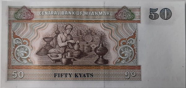 Na rewersie została przedstawiona stylizowany wizerunek rzemieślnika wytwarzającego naczynia. W lewym dolnym rogu banknotu oraz w prawym górnym rogu nominał banknotu 50. U dołu banknotu na środku słownie nominał banknotu i nazwa waluty: FIFTY KYATS. U góry banknotu napis: CENTRAL BANK OF MYANMAR (Centralny Bank Birmy)