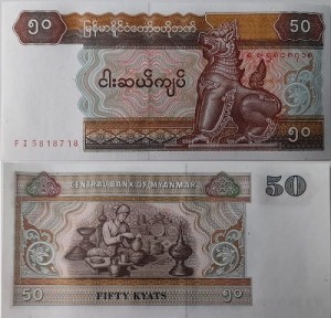 Banknot obiegowy 50 Kyat birmańskich z serii banknotów z umieszczonym lewem (Chinthe). Seria ta obejmuje banknoty od 1 do 1000 (1, 5, 10, 20, 50, 100, 200, 500 oraz 1000) kyat birmańskich. Pierwszy znany banknot w tym stylu graficznym został wemitowany 1994 roku.