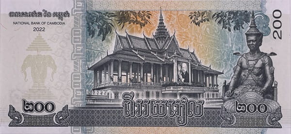 200 riels 2022 r. - banknot 200 riels Kambodża z kategorii obiegowe banknoty świata kontynent Azja, emitent Narodowy Bank Kambodży, materiał papier, stan UNC