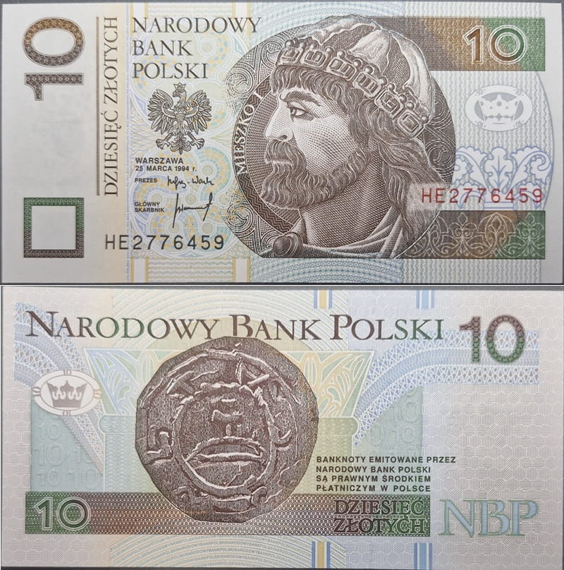 Banknot 10 złotych 1994 r. Mieszko I - Banknot obiegowy RP. Materiał - papier, emitent - Narodowy Bank Polski, producent - Państwowa Wytwórnia Papierów Wartościowych w Warszawie.