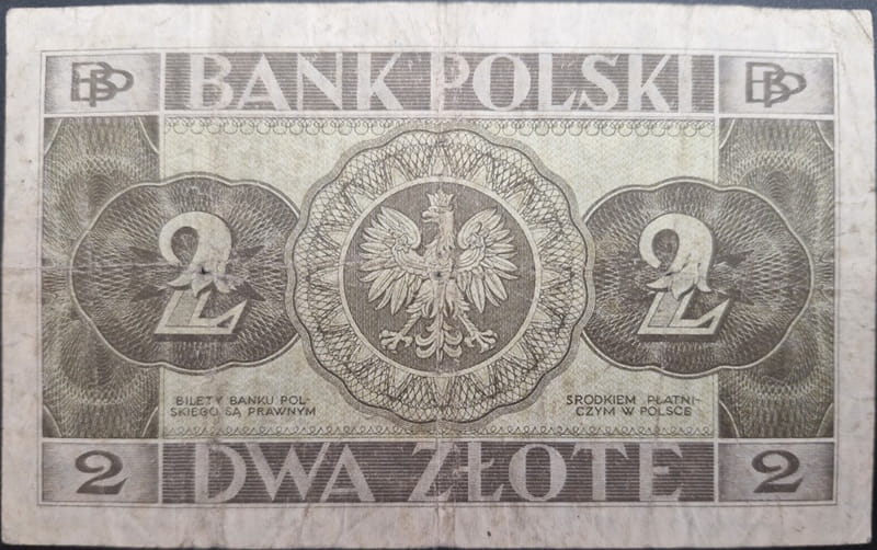 Banknot obiegowy emitowany przez Bank Polski, nominał 2 złote, rok emisji 1936, wymiary banknotu 102 mm x 63 mm, materiał papier, banknot w folijce ochronnej, stan zachowania +4, real foto