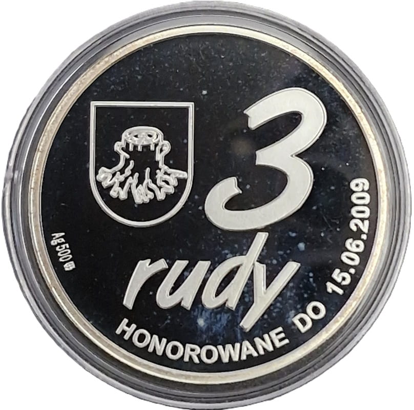 Po lewej stronie herb miasta, obok bardzo duży nominał 3, a pod nim napisy Rudy. U dołu przy rancie monety napisy: Honorowany do 16.06.2009. Po lewej stronie przy rancie monety próba Ag500 oraz znak Mennicy Polskiej S.A.: m/w